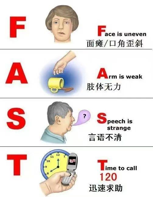 “脑卒中”又称“中风”、“脑血管意外”,是一种急性脑血管疾病,是由于脑部血管突然破裂或因血管阻塞导致血液不能流入大脑而引起脑组织损伤的一组疾病,包括缺血性和出血性卒中。缺血性卒中的发病率高于出血性卒中,占脑卒中总数的60%~70%。颈内动脉和椎动脉闭塞和狭窄可引起缺血性脑卒中,年龄多在40岁以上,男性较女性多,严重者可引起死亡,出血性卒中的死亡率较高,脑卒中具有发病率高、死亡率高和致残率高的特点。01脑卒中发生时的症状表现急性脑卒中发生时很容易判断。记住“FAST”。F是face,面部出现嘴角下沉、伸舌偏向一侧;A是arm,抬胳膊,一侧手臂无力,麻木;S是speech,说话口齿不清,别人听不懂;T就是time,要迅速求助,打电话叫急救车。