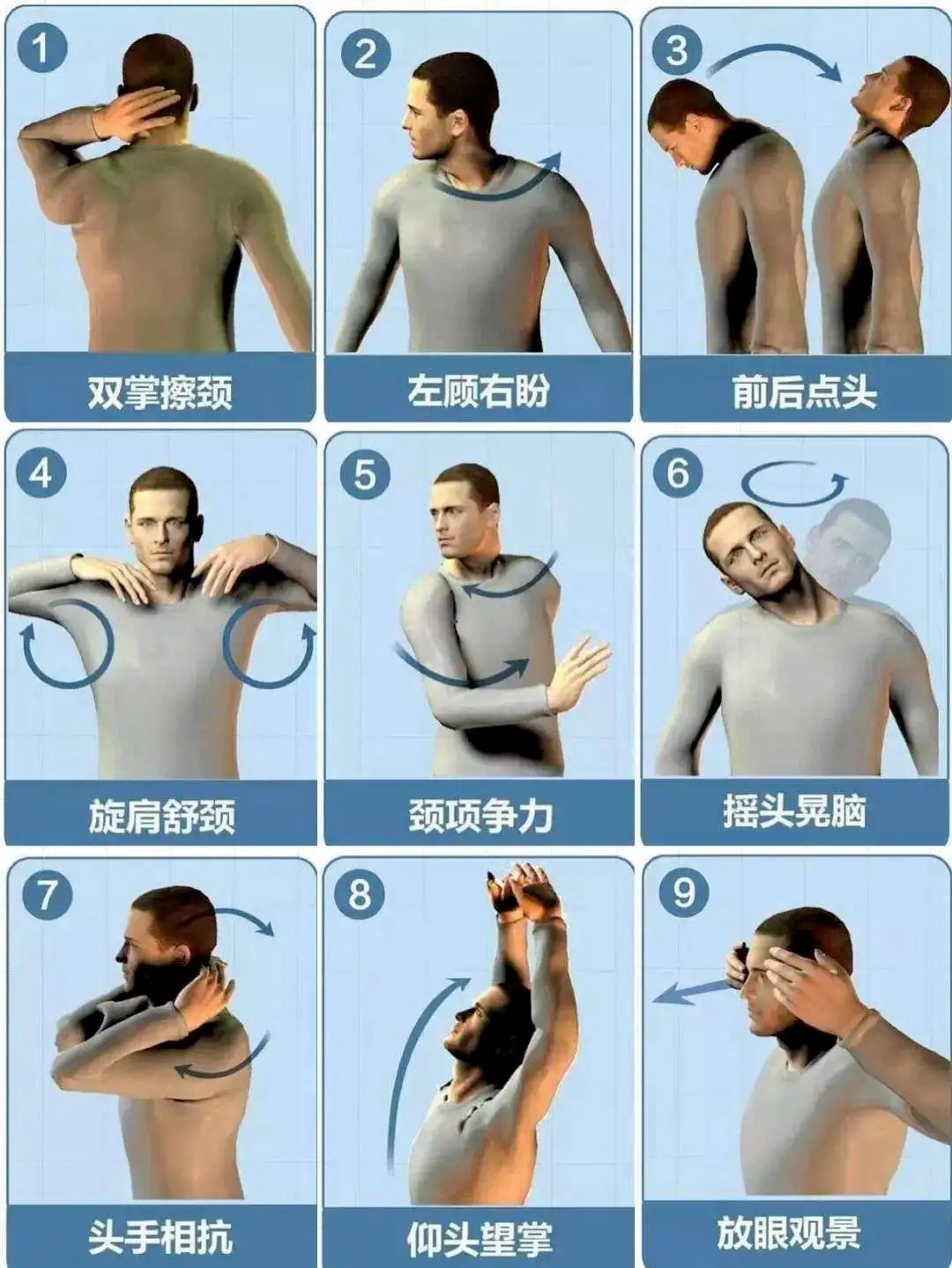 2、做左顾右盼这一项锻炼,眼睛平视前方,头向左边转至90度之后回正,然后再向右转至90度,以此循环做25~30次,可有效的减缓颈椎疼痛。