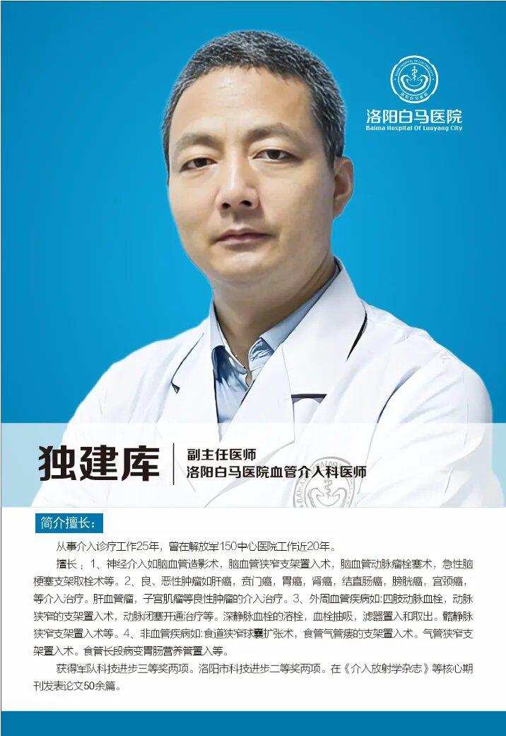 科室由独建库主任领衔。独主任拥有长达25年的介入诊疗经验,曾在解放军150中心医院工作近20年,在处理各类复杂血管疾病及出血急症方面经验丰富。在他的带领下,团队能够根据每位患者的具体情况,制定个体化的介入治疗方案。