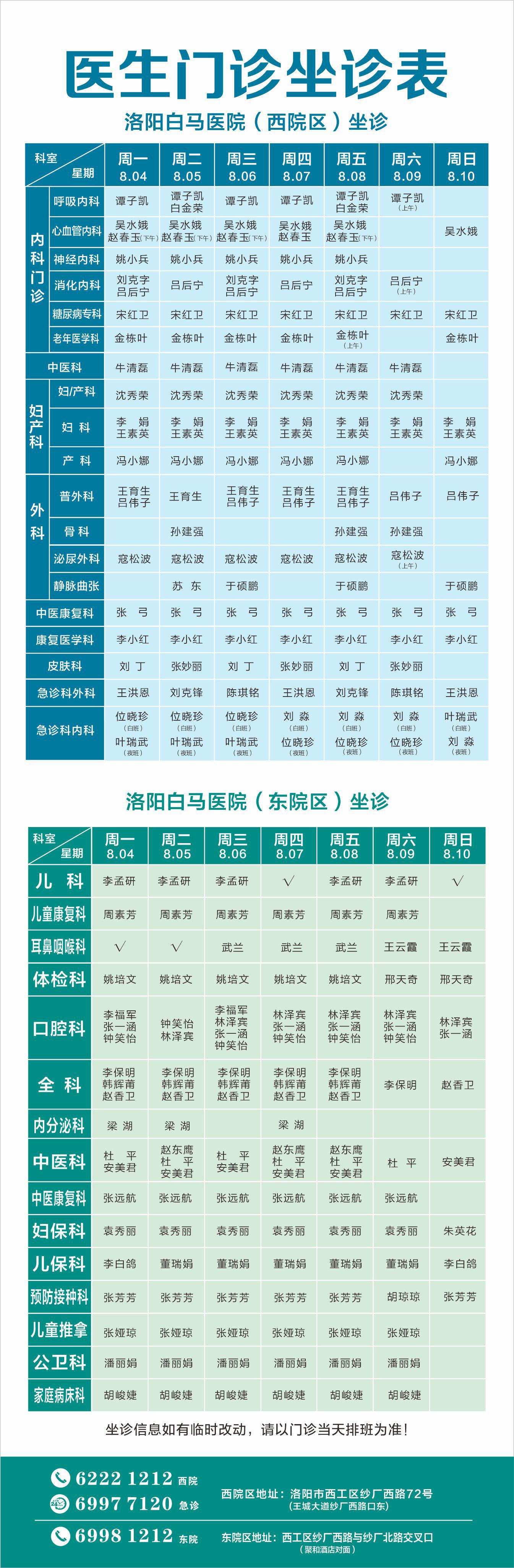 【8.04-8.10】洛阳白马医院医生门诊排班表