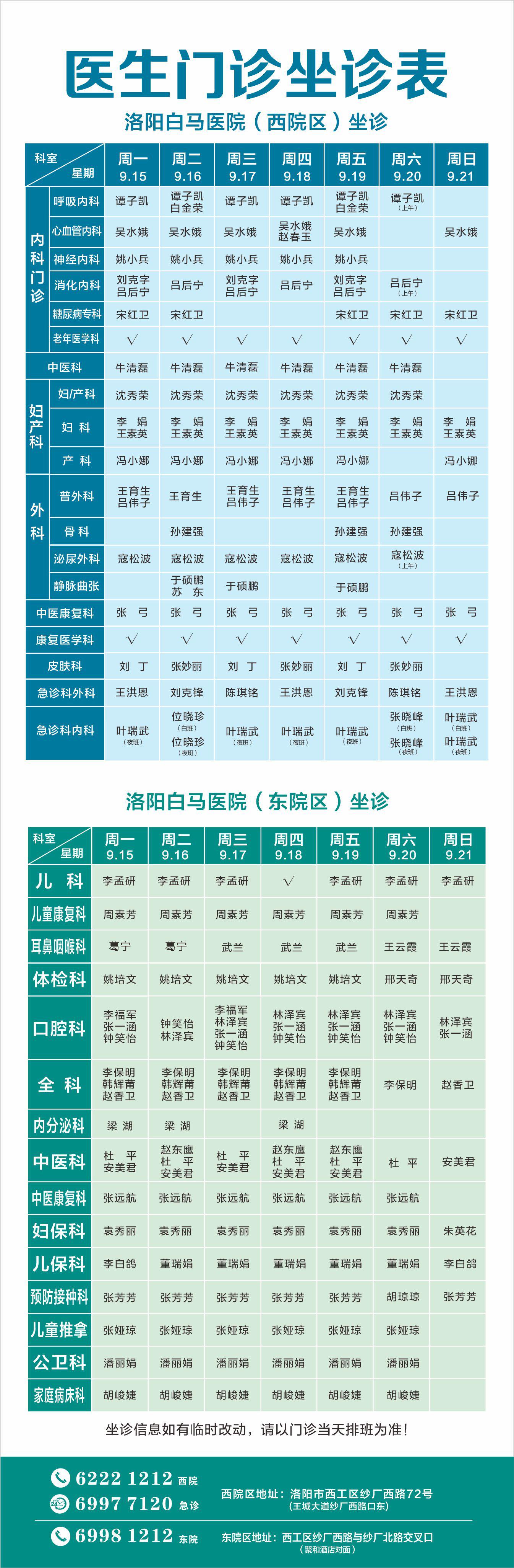 【9.15-9.21】洛阳白马医院医生门诊排班表