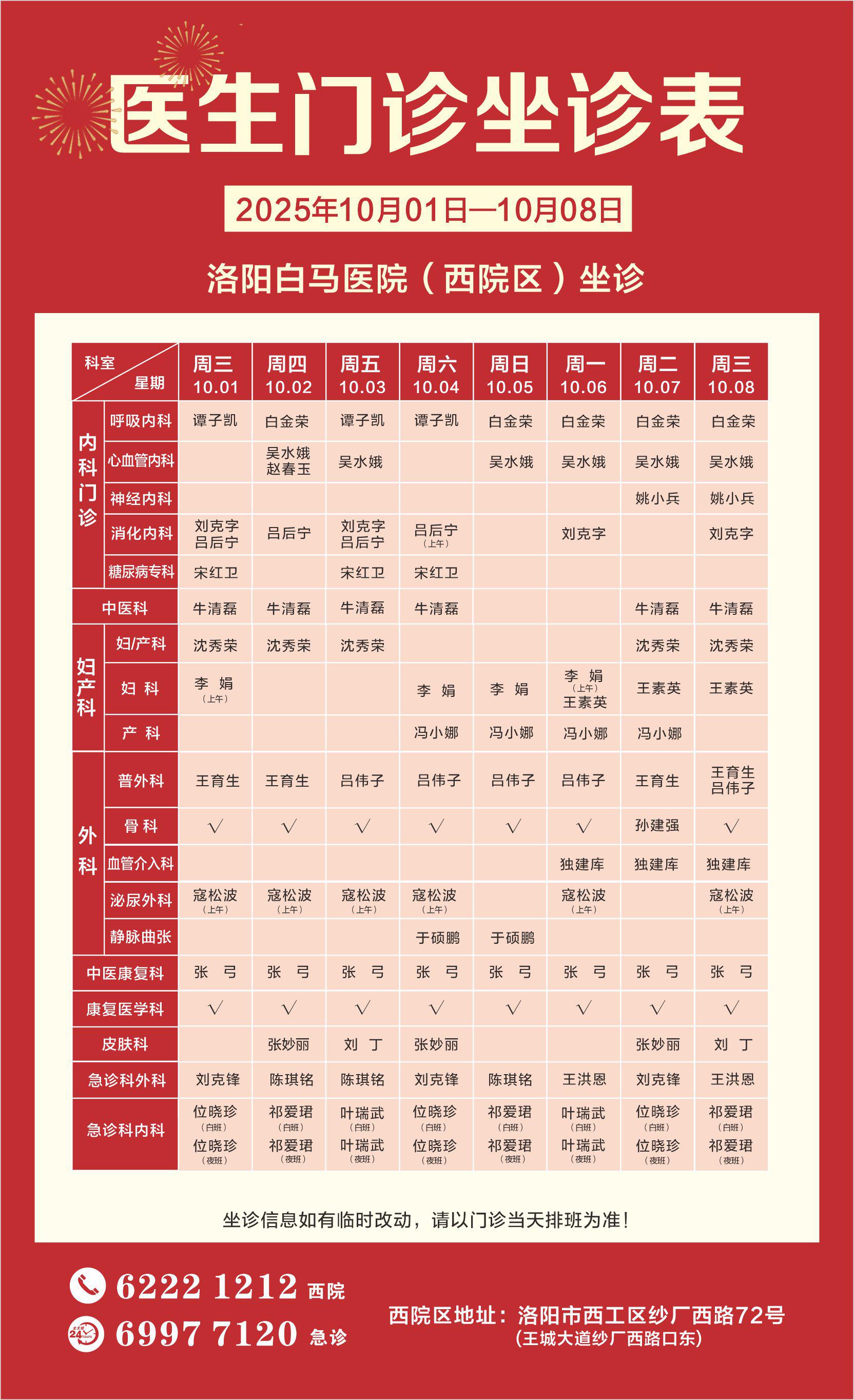 【10.1-10.08】洛阳白马医院医生门诊排班表