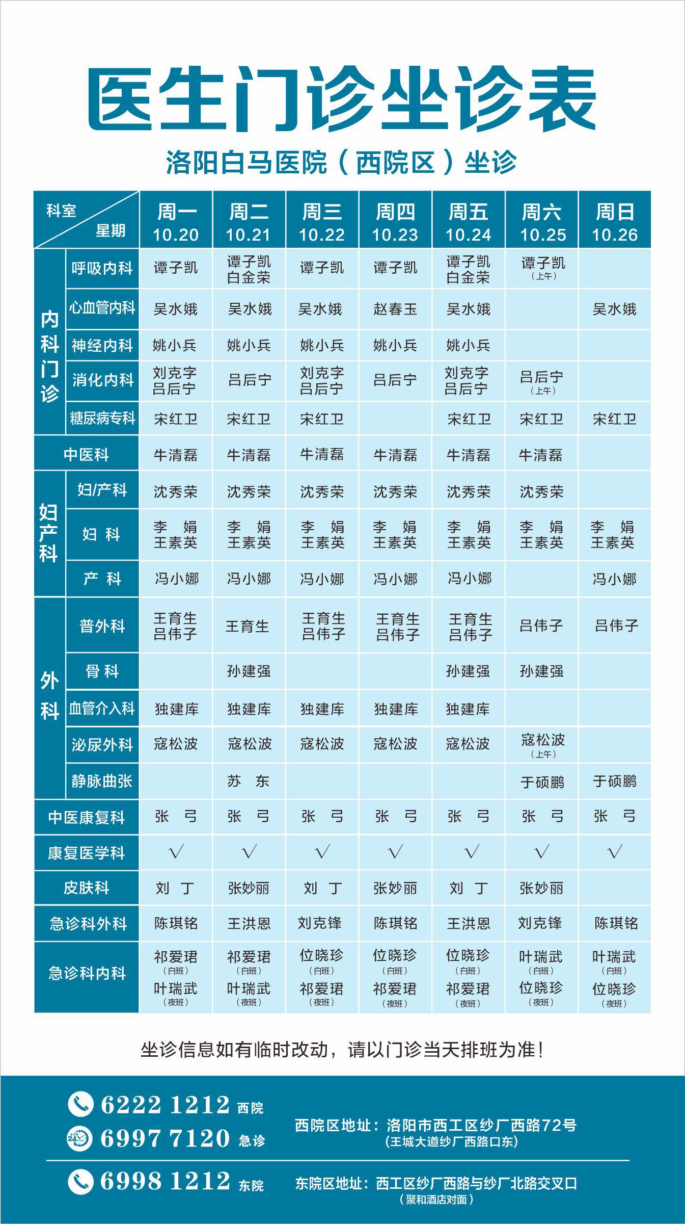 【10.20-10.26】洛阳白马医院医生门诊排班表