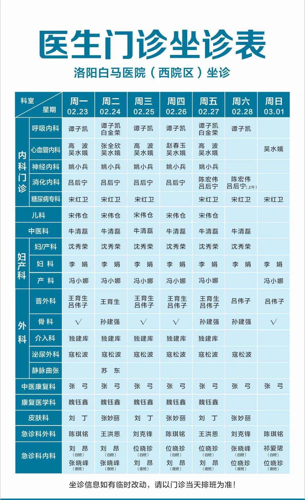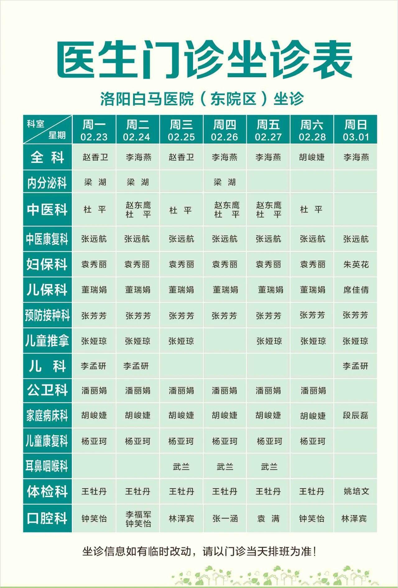 【2.23-3.1】洛阳白马医院医生门诊排班表
