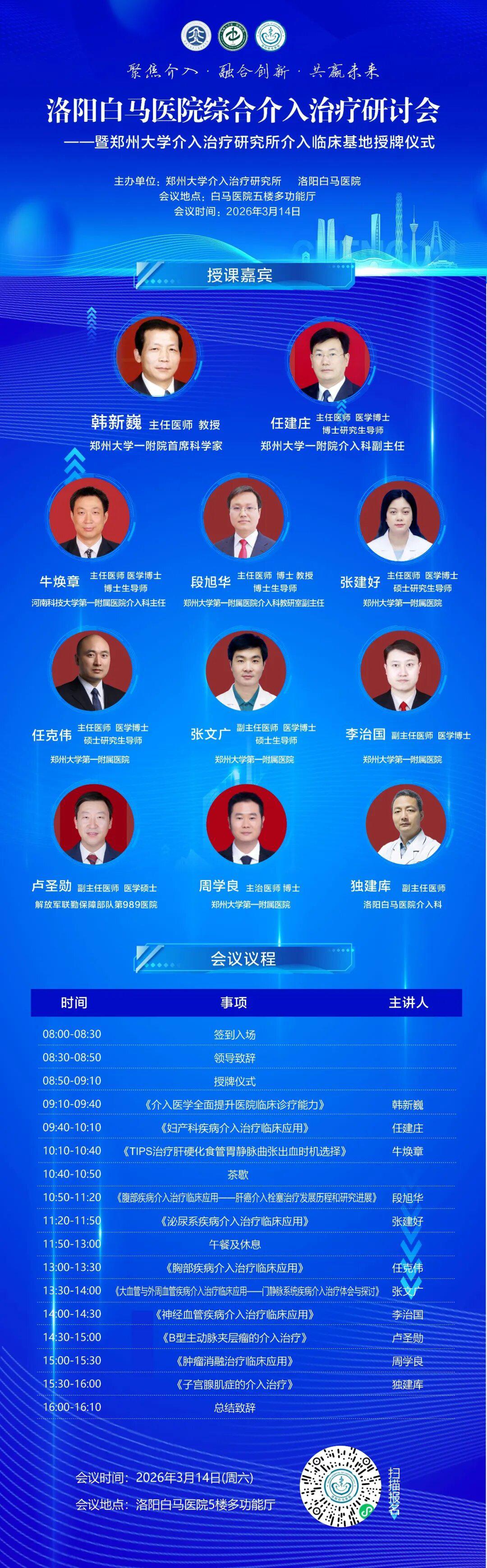 为推动区域介入诊疗技术规范化、精准化发展,搭建高水平学术交流平台,我院定于2026年3月14日,举办洛阳白马医院综合介入治疗研讨会,同期隆重举行郑州大学介入治疗研究所白马医院临床基地授牌仪式。